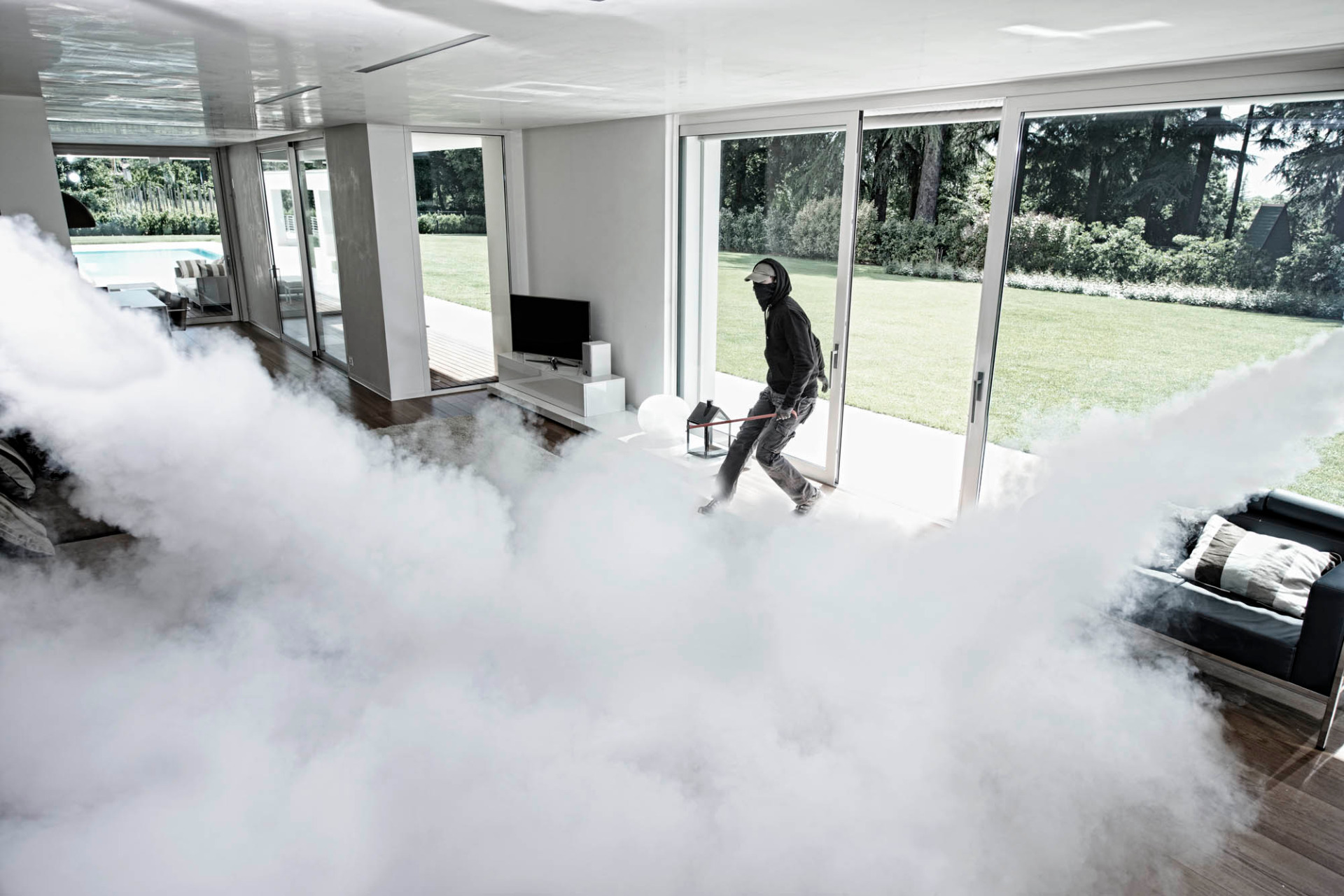 Questa "nuova" tecnologia vede ancora molte persone dubbiose e incredule, resta però un sistema di sicurezza attivo e molto efficace. Queste apparecchiature producono in caso di allarme una nebbia molto fitta che rende impossibile vedere qualsiasi cosa e quindi rubarla. La nebbia è prodotta con un liquido alimentare, simile a quello per le sigarette elettroniche. Non sporca o macchia in nessun modo, infatti questo sistema è stato testato ed adottato da rinomate boutique. Un microprocessore gestische questi sistemi e li interfaccia a qualsiasi impianto antintrusione, in modo tale da generare l' attivazione dopo piu' segnalazioni ed eliminare l' attivazione su falsi allarmi. Ideale per negozi, tabaccherie e sale slot dove il furto avvieni mediamente in meno di 1 minuto ed in quel minuto anche se l' allarme segnala, i malfattori possono agire indisturbati. Il sistema nebbiogeno è in grado di saturare l' ambiente con una nebbia fitta, già nei primi secondi dopo efferazione.